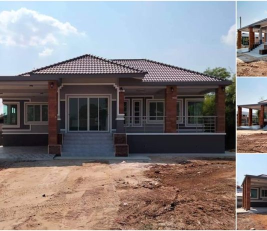 สวัสดีเพื่อนสมาชิก ดูไอเดียบ้าน และผู้ชื่นชอบแบบบ้านสวยๆ หรือกำลังหาแบบบ้าน ไอเดียสำหรับสร้างบ้านในฝันของตัวเองกันอยู่ ฝากติดตามเพจและเว็บไซต์ของเราไว้ด้วยนะครับ เรามีแบบบ้านสวยและไอเดียบ้านดีๆ มาให้ชมกันเป็นประจำทุกวัน สำหรับบ้านที่เรานำมาฝากวันนี้ลักษณะออกแบบเป็นบ้านพักอาศัยแบบชั้นเดียวแนวโมเดิร์นหลังคาแบบเพิงแหงนเรียบง่ายมุงด้วยเมทัลชีทฝ้าชายคาสีขาวแบบมีรูระบายความร้อนด้วย ตัวบ้านยกระดับพื้นสูงประมาณ 70 เซนติเมตร ผนังภายนอกโทนสีเทาตัดกับสีน้ำตาล หน้าบ้านมีระเบียงมุงหลังคาพร้อมทำม้านั่งเล่นพักผ่อนปูพื้นด้วยกระเบื้องและทำราวกั้นตก รอบตัวบ้านทำทางเดินเทด้วยพื้นคอนกรีต ชมความสวยงามกันต่อเลยครับ
