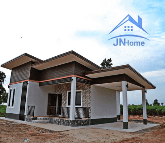 สวัสดีเพื่อนสมาชิก ดูไอเดียบ้าน และทุกท่านที่สนใจแบบบ้าน ไอเดียสร้างบ้าน กำลังมองหาแบบบ้านหรือไอเดียสำรับสร้างตัวเอง วันนี้เรามีแบบบ้านสวยๆ มากฝากกันอีกเช่นเคย สำหรับแบบบ้านหลังนี้ บ้านชั้นเดียวทรงโมเดิร์นทันสมัย ลักษณะบ้านออกแบบบ้านชั้นเดียว ตัวบ้านยกพื้นสูง 1 เมตร หลังคาแบบเพิงแหงนเรียบง่ายสวยงาม หน้าบ้านมีเฉลียงและหลังบ้านมีระเบียงกว้างๆ สำหรับเพื่อนที่พักผ่อนด้วย