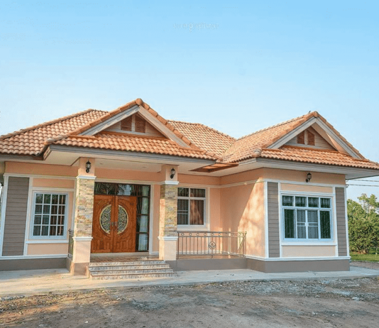 สวัสดีเพื่อนสมาชิก ดูไอเดียบ้าน และทุกท่านผู้สนใจแบบบ้านสวยหรือกำลังจะสร้างบ้านมองหาแบบบ้านไอเดียสำหรับสร้างบ้านกันอยู่ วันนี้ทางเว็บเราก็มีแบบบ้านสวยมาฝากอีกหลัง สำหรับบ้านหลังนี้การออกแบบเป็นบ้านชั้นเดียวสไตล์โเดิร์น รูปทรงตัวบ้านแบบตัวแอล หลังคาแบบทรงแหงนเรียบง่าย ตัวบ้านยกระดับพื้นสูงเล็กน้อย หน้าบ้านมีระเบียงสำหรับพื้นที่พักผ่อน ผนังภายนอกโทนสีเทาตัดส้มเพิ่มความโดดเด่น ผนังตกแต่งความสวยงามด้วยหินทราย หลังบ้านมีมุมหลังคาต่อเติมพื้นที่ใช้สอยกว้างๆ บ้านหลังนี้เป็นบ้านของคุณ Wilawan Komolperin สมาชิกกลุ่มดูไอเดียบ้าน ติดตามชมความสวยงามกันต่อเลยครับ