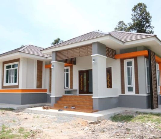 สวัสดีเพื่อนสมาชิก ดูไอเดียบ้าน และผู้ชื่นชอบแบบบ้านสวยๆ หรือกำลังหาแบบบ้าน ไอเดียสำหรับสร้างบ้านในฝันของตัวเองกันอยู่ ฝากติดตามเพจและเว็บไซต์ของเราไว้ด้วยนะครับ เรามีแบบบ้านสวยและไอเดียบ้านดีๆ มาให้ชมกันเป็นประจำทุกวัน สำหรับบ้านที่เรานำมาฝากวันนี้ลักษณะออกแบบเป็นบ้านพักอาศัยแบบชั้นเดียวหลังคาแบบทรงลาดเอียงซ้อนเล่นระดับเข้ากับรูปทรงตัวบ้านมุงหลังคาด้วยเมทัลชีท ตัวบ้านยกระดับพื้นสูงประมาณ 1 เมตร ผนังภายนอกโทนสีเทาอ่อนตัดเข้มและสีน้ำตาลเลือดหมูผนังชายคาแซมด้วยลายเส้สสีส้มเสริมความสวยเด่น หน้าบ้นมีระเบียงมุงหลังคาขนาดใหญ่กว้างขวางพร้อมทำม้านั่งเล่นพักผ่อนเป็นพื้นที่ทำกิจกรรมของครอบครัวและโรงจอดรถได้เทพื้นด้วยคอนกรีต ชมความสวยงามกันต่อเลยครับ